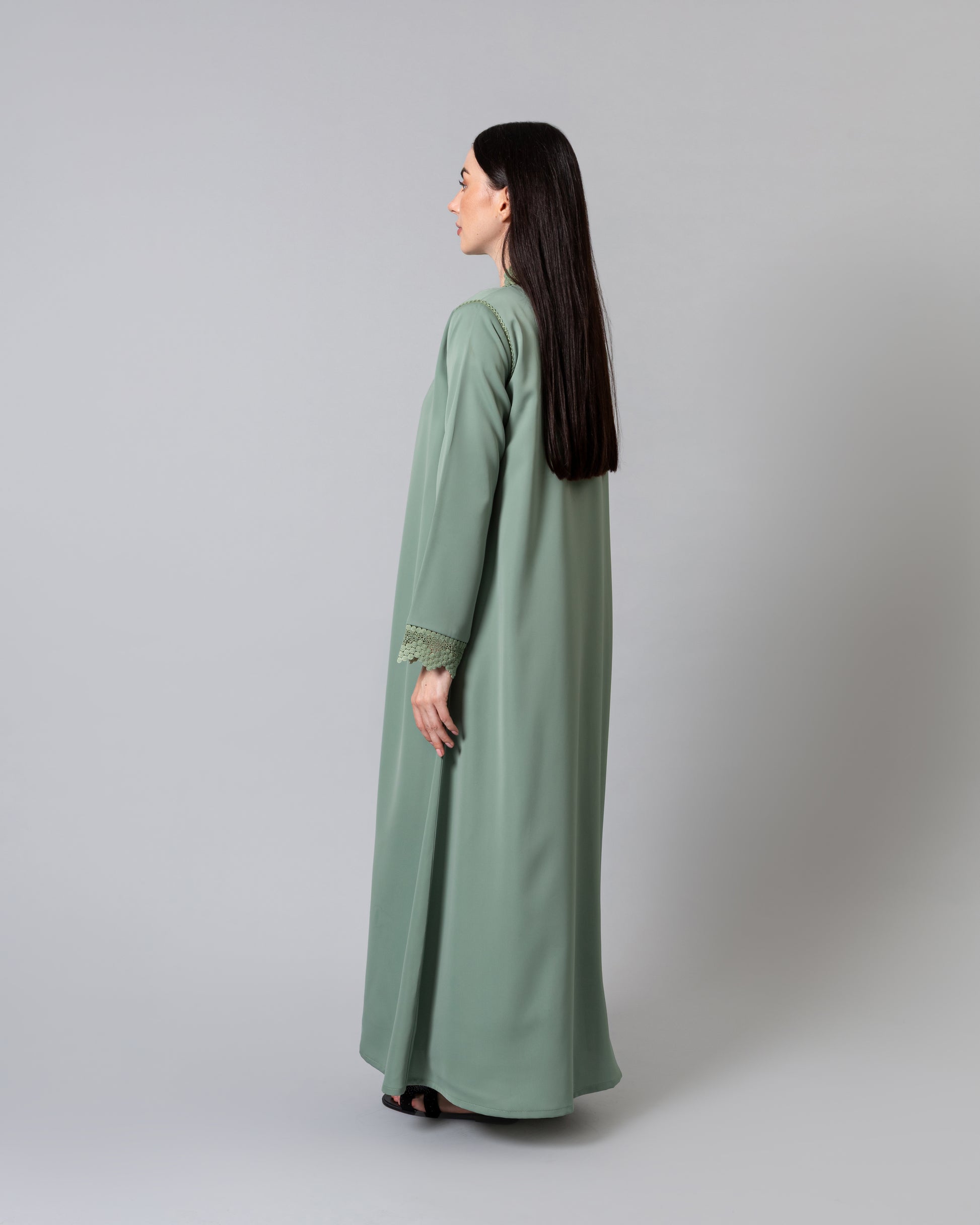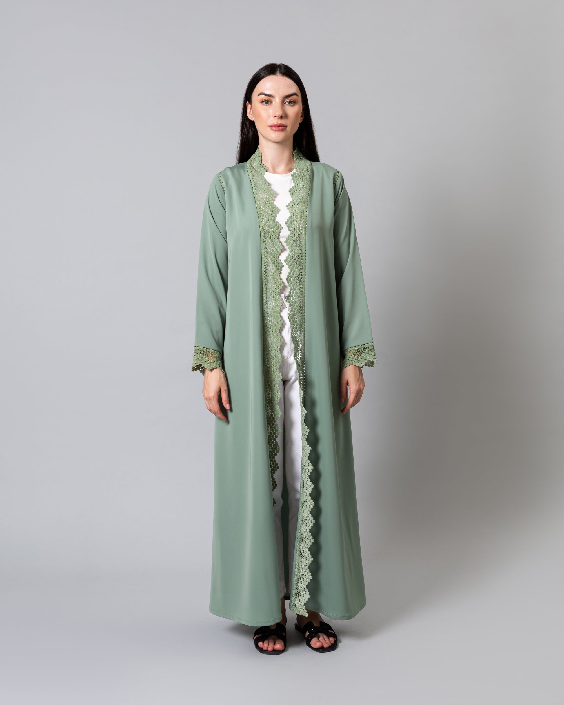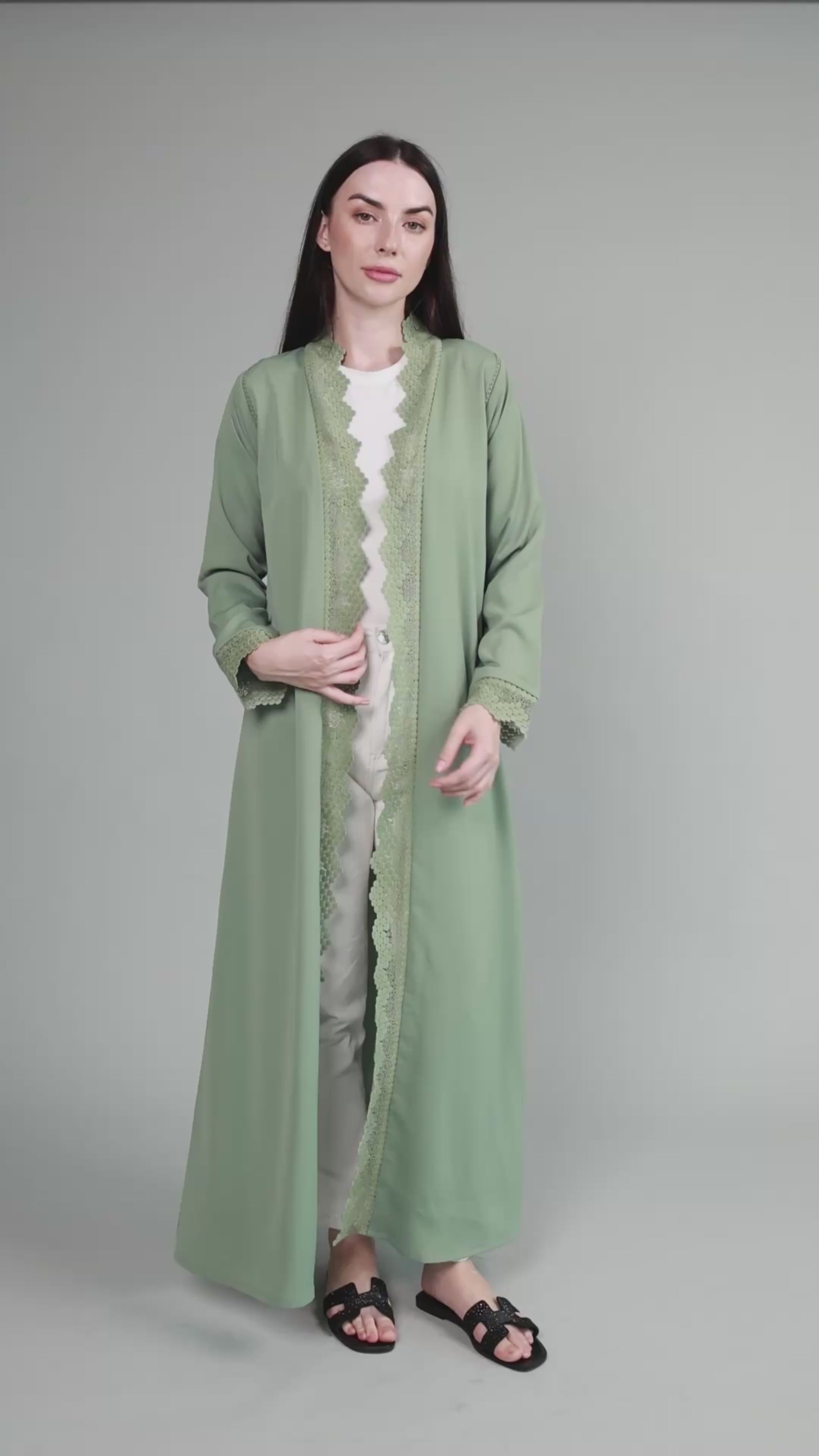 Soft light weight material with a subtle sheen finish. Includes a matching sheila.