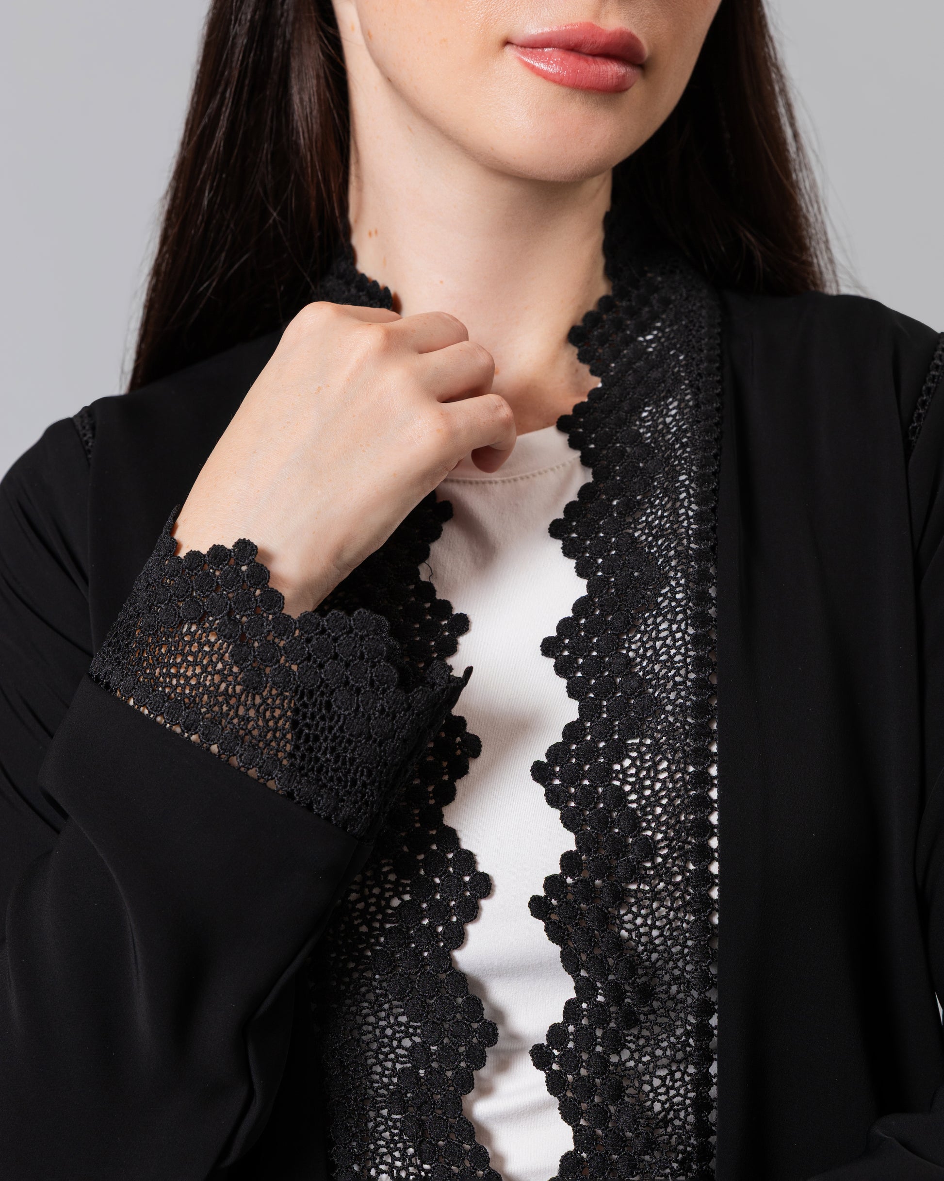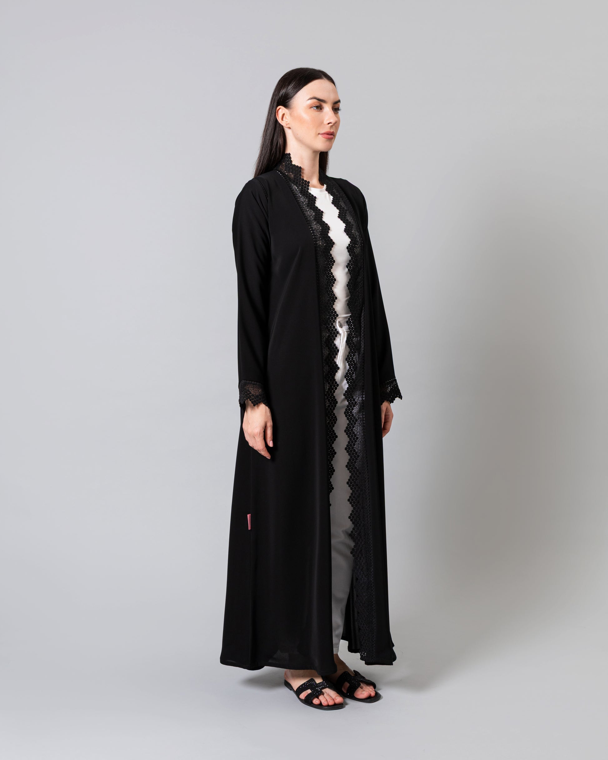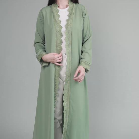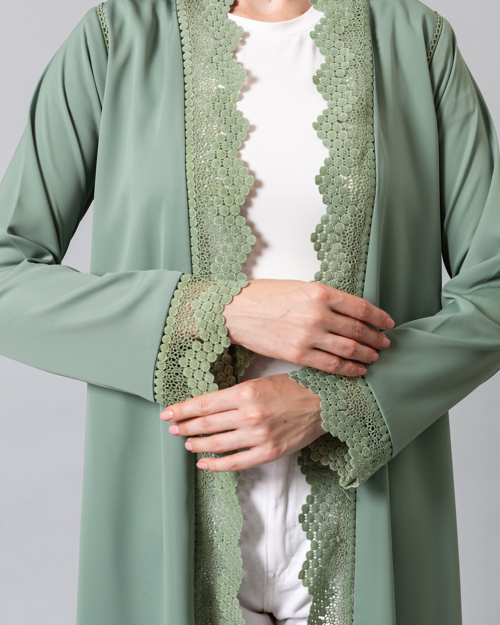 Soft light weight material with a subtle sheen finish. Includes a matching sheila.